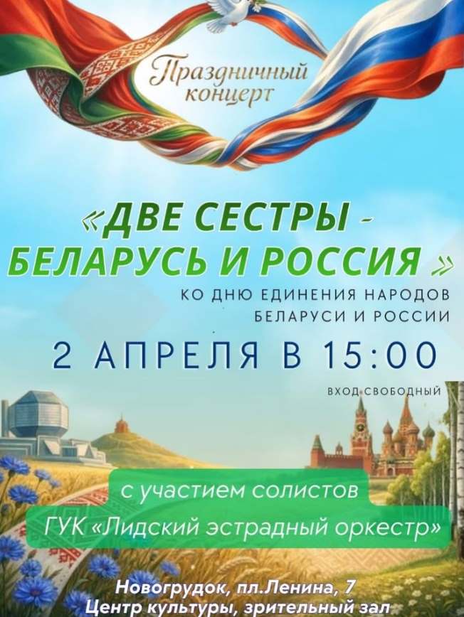 2 красавіка ў 15:00 запрашаем вас на святочны канцэрт “Дзве сястры – Беларусь і Расія” (г. Навагрудак, глядзельная зала Цэнтра культуры, пл. Леніна, 7), які стане сапраўдным святам брацкай сувязі! Гэта цудоўная магчымасць ушанаваць нашу агульную гісторыю і багатую культуру.
