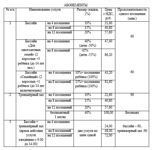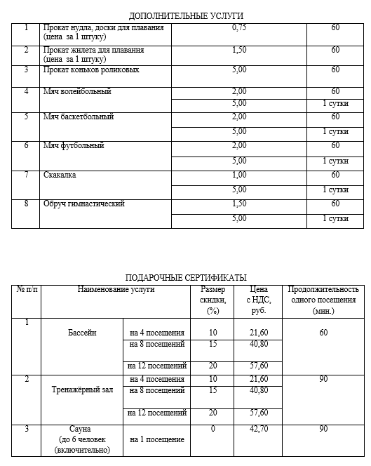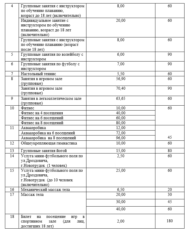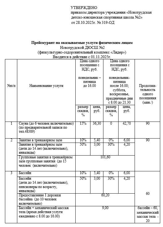 Прейскурант на оказываемые услуги физическим лицам Новогрудской ДЮСШ №2 (физкультурно-оздоровительный комплекс «Лидер») Вводится в действие с 01.11.2025г.