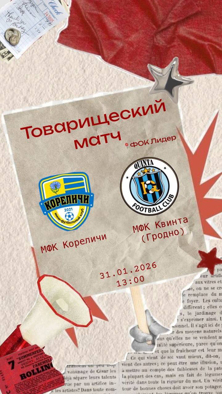 Пройдет товарищеская встреча с любительской командой из Гродно — МФК Квинта. 📅 Суббота, 13:00 📍 ФОК «Лидер» 💵 Вход платный